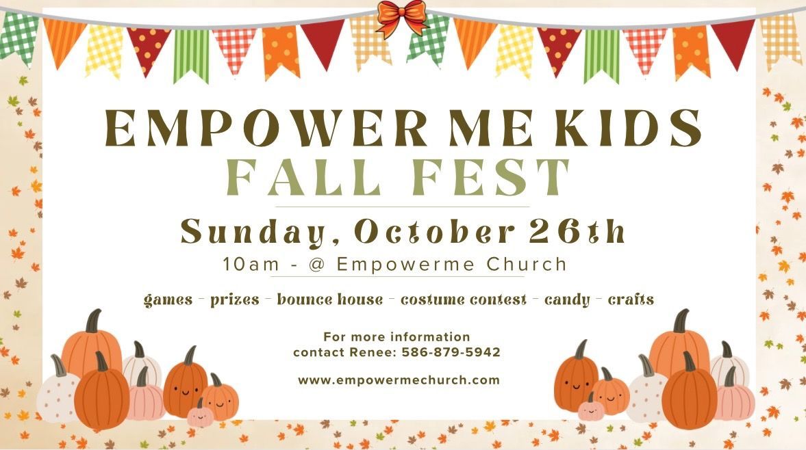 Join us for the Empower Me Kids Fall Fest on Sunday, October 26th at 10 AM right here at Empower Me Church! This family-friendly event promises fun for everyone with exciting games, amazing prizes, a fantastic bounce house, and a lively costume contest. Plus, we’ll have plenty of candy and crafts for the little ones to enjoy! Let’s celebrate the joy of community and experience God’s goodness together in a vibrant atmosphere where all ages are welcome. Don’t miss out on the fun!